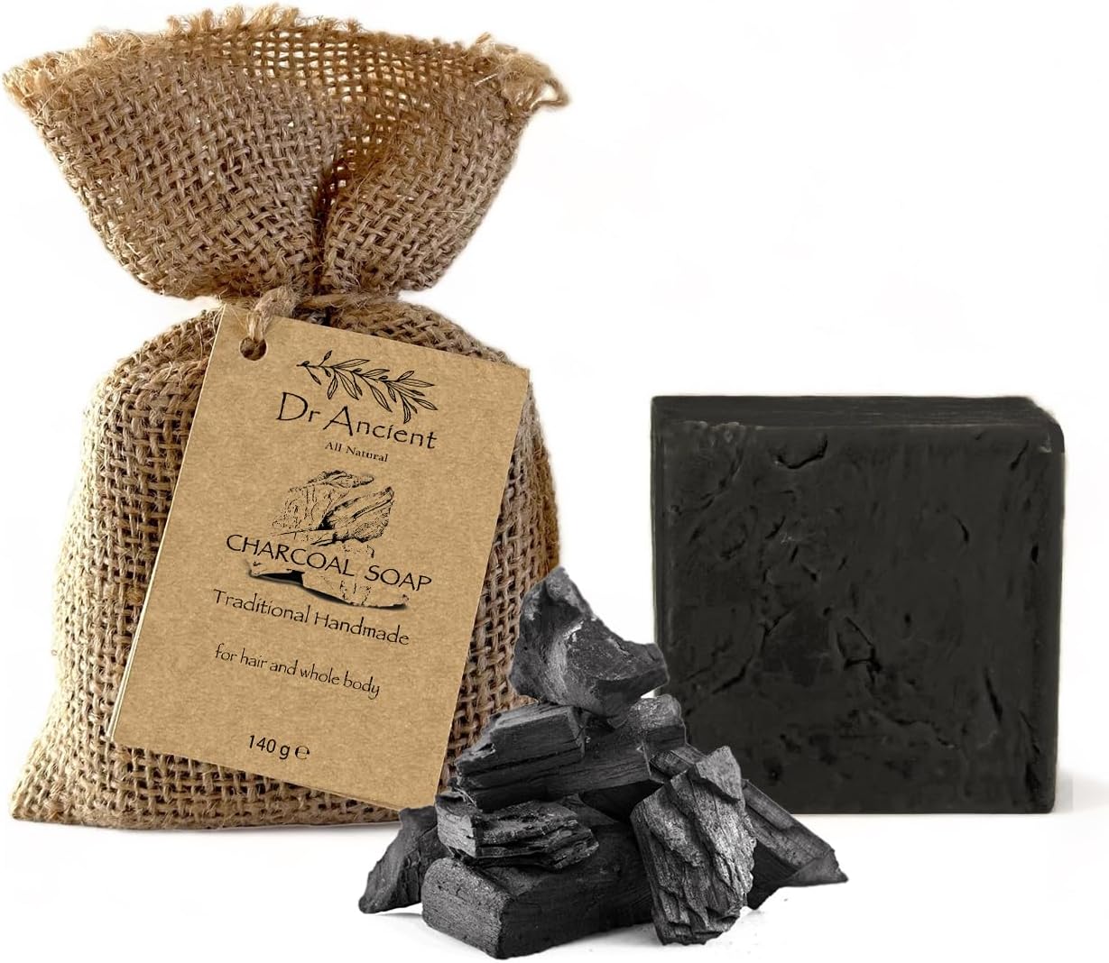 Y si hablamos de jabones naturales “de los de verdad”, el carbón activado tiene que estar en la lista… y aquí la marca Dr. Ancient se luce muchísimo. Este jabón es totalmente artesanal, hecho a mano con un estilo tradicional que se nota nada más verlo. Tiene ese toque rústico del saquito de arpillera que parece sacado de un mercado antiguo, pero con la ventaja de una formulación natural, vegana y sin químicos agresivos.
